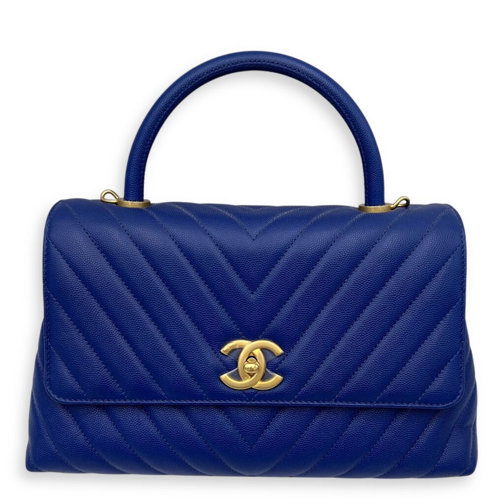 Coco Medium Blue Top Handle Bag in Caviar Leather, Gold hardware