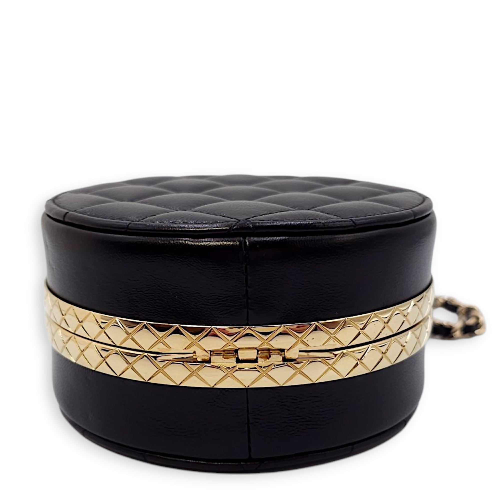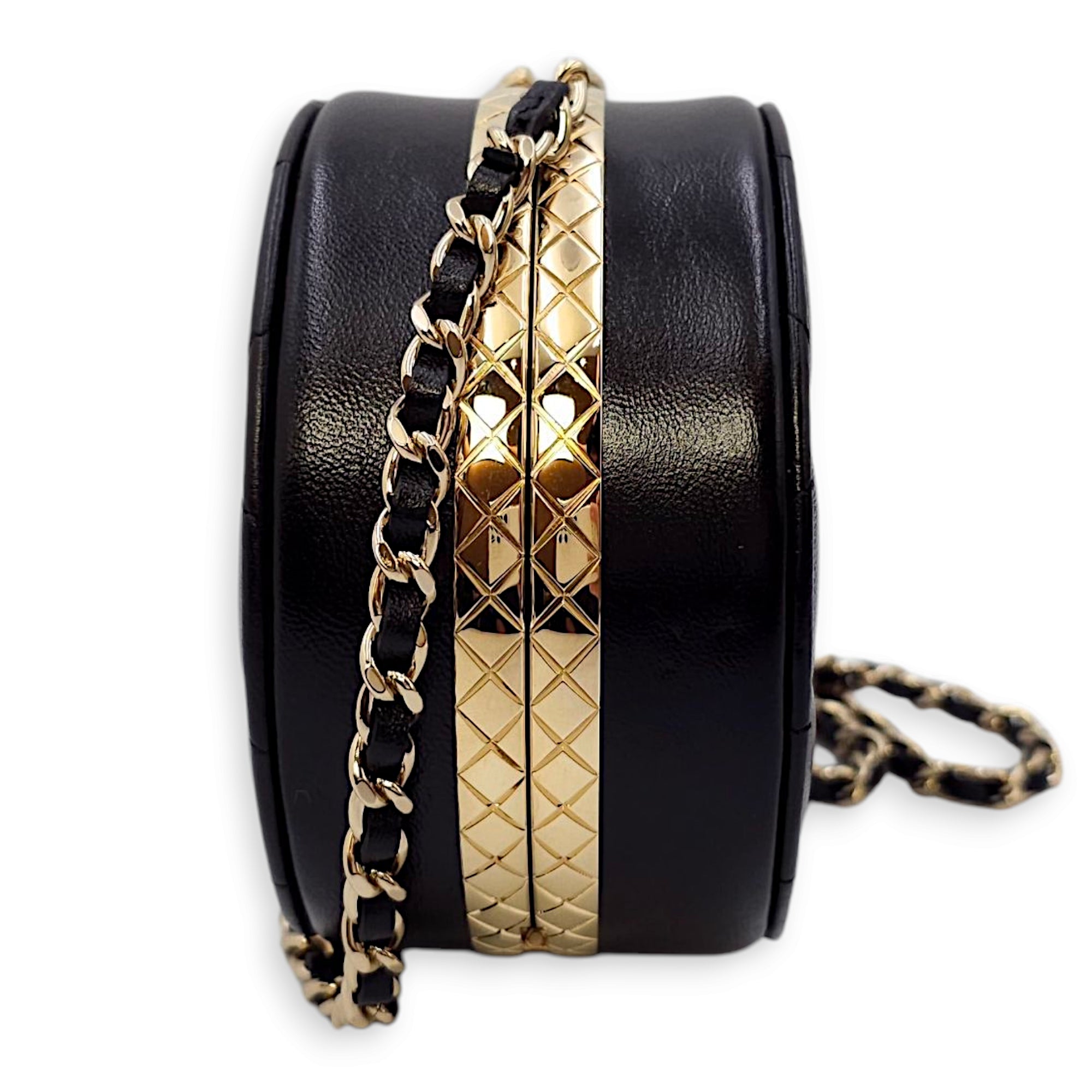 Quilted Filigree Chain Around Circle Black Crossbody Bag in Lambskin, Gold hardware